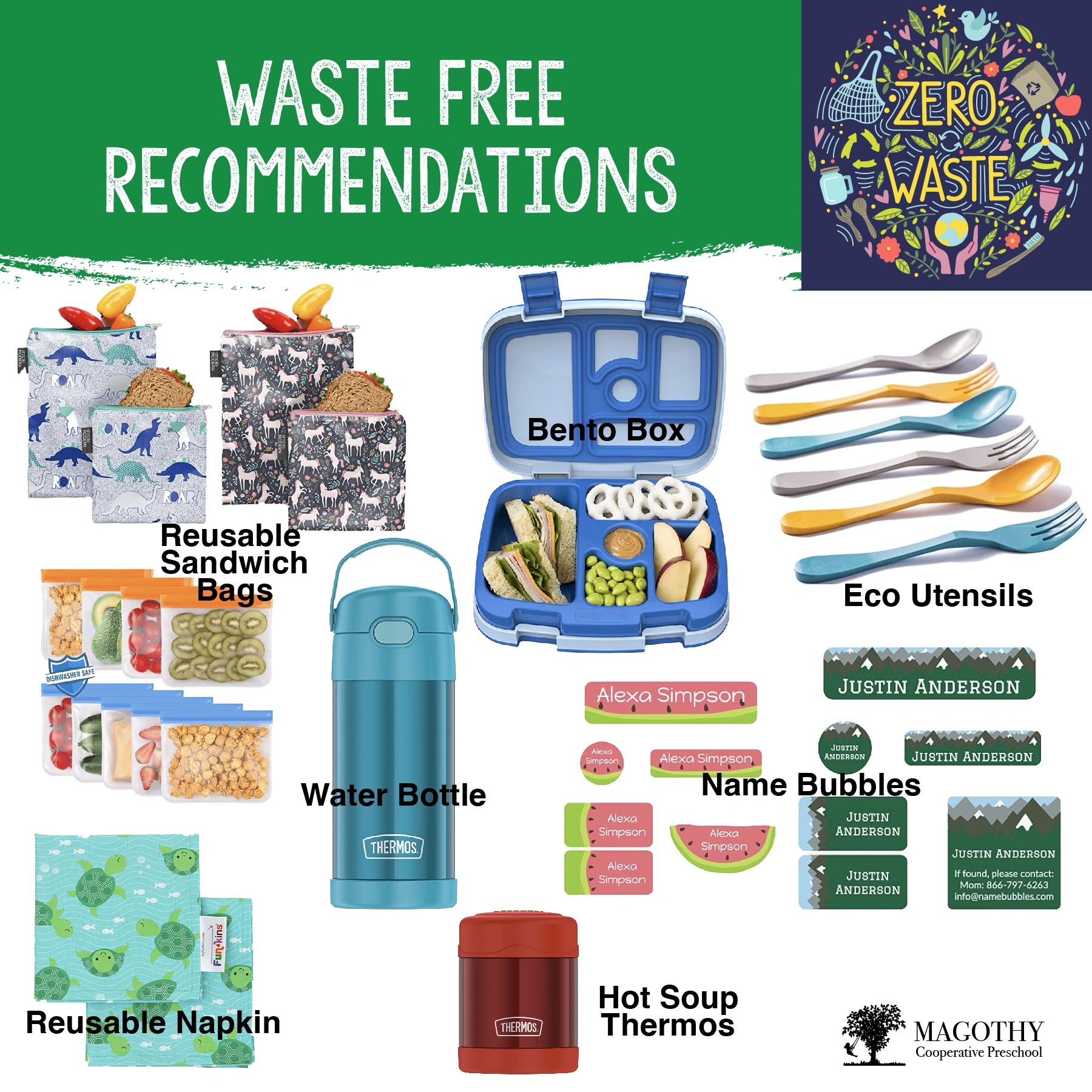 Here are a few products recommended by teachers and parents to help make your lunch and snack waste free! Don't forget to label your reusable items so they don't get lost!